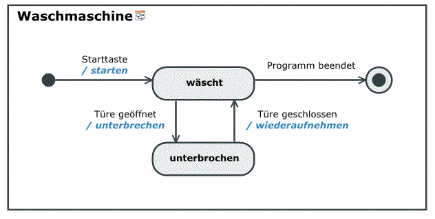 Ein Zustandsautomat beschreibt ein System durch Zustände und Transitionen zwischen diesen Zuständen. Ein Zustandsautomat beschreibt eine hypothetische Maschine ("endlicher Automat"), die sich zu jedem Zeitpunkt in einer Menge endlicher Zustände befindet. Zustandsautomaten bilden vornehmlich das Verhalten von Klassen ab. Doch im Gegensatz zu Aktivitäten, die Aktionen beschreiben, werden in Zustandsautomaten die Zustände festgehalten, die ein Objekt im Laufe seines Lebens einnehmen kann. Mittels Bedingungen und Kontrollen wird festgelegt, welche Transitionen (Zustandsübergänge) ausgeführt werden können. |