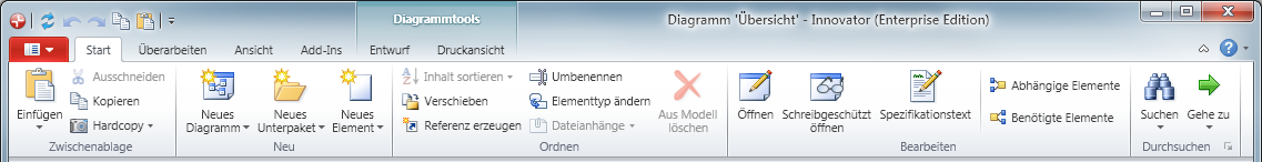 Im Menüband befinden sich neben dem Anwendungsmenü stets die Standardregister Start, Ansicht und Add-Ins mit ihren Gruppen und Befehlen. Weitere Register tauchen erst in einem konkreten Kontext auf, z. B. wenn ein Diagramm zur Bearbeitung geöffnet ist. Für einen solchen Kontext kann eine kontextabhängige Registerkartengruppe (Contextual Tab Group) definiert sein, in der zusätzliche Befehle über ein oder mehrere Register zur Verfügung gestellt werden, die nur in diesem Kontext ausführbar sind.