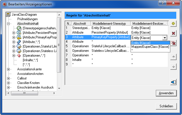 Für einige Elementtypen gibt es weitere Ebenen, in denen analog zur ersten Ebene Regeln definiert werden können. So können Sie z.B. bei Operationen Einstellungen für Parameter vornehmen. Diese zusätzlichen Ebenen wurden geschaffen, um die Übersichtlichkeit zu erhöhen. Außerdem können Sie auf diese Weise für die geschachtelten Elemente auch nach Stereotypen getrennte Einstellungen vornehmen.