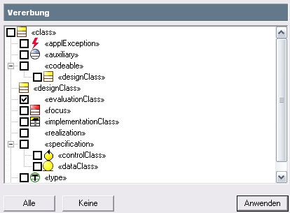 Die Einstellung der Sichtbarkeit wird über die Generalisierungen der Stereotype vererbt. Eine Eigenschaft, die bei einem Oberstereotyp abgewählt wurde, wird beim Unterstereotyp nicht mehr zur Auswahl angeboten.