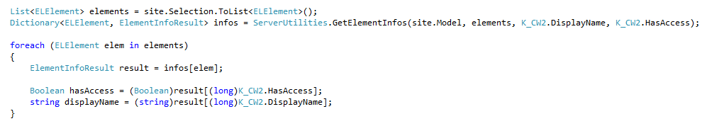 Wesentlich schneller ist es, alle Informationen mit einem einzigen Telegramm über die Methode ServerUtilities.GetElementInfos (Util.dll) zu bestimmen. Im folgenden Beispiel werden Name und Zugriff der Elemente ermittelt.