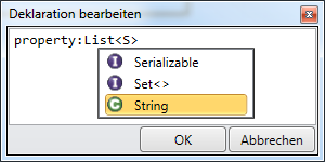 Die Auswahlliste des Intellisense-Dialogs erscheint als Eingabehilfe und bietet Ihnen als Typ des Attributs die im Modell bekannten Classifier in alphabetischer Sortierung an. Classifier, die Templates sind, sind durch spitze Klammern am Namensende gekennzeichnet: