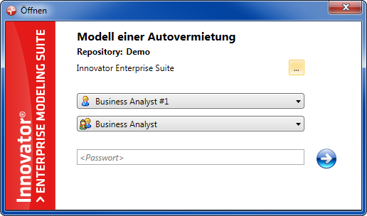 Mit dieser Schaltfläche bestätigen Sie Ihre Eingaben. Innovator prüft die Angaben und liefert ggf. eine Fehlermeldung wie "Falsches Passwort". Bei erfolgreicher Prüfung wird das Modell geöffnet.