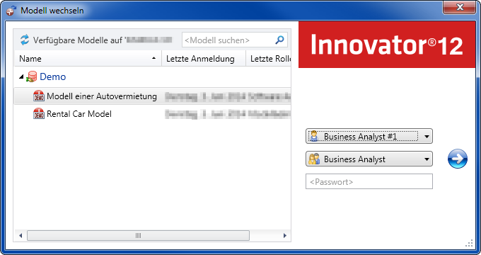 Für bestimmte Verfahren ist das Anmelden an einem Innovator-Modell erforderlich, ohne dass das Modell in der Innovator-Oberfläche geöffnet wird. Mit der Anmeldung stehen die Daten des Modells dann z.B. für einen Modellvergleich zur Verfügung.