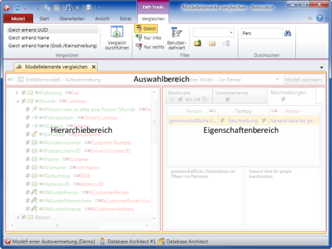 Der Editor Modellelemente vergleichen zeigt die Unterschiede zwischen Elementen an.