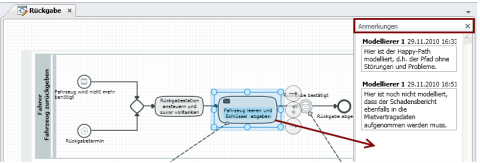 You can add annotations to each diagram element to communicate with other users editing the modeling process.