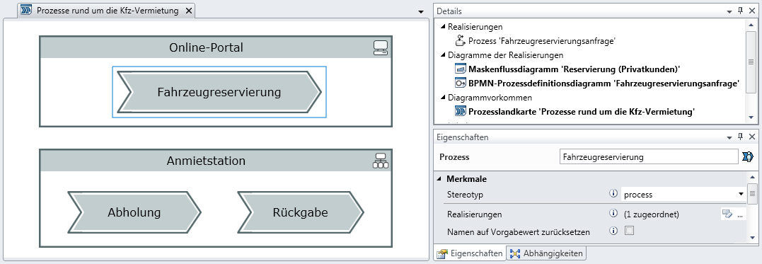 The following diagram shows the Details area of a process in the process map; it was modeled in BPMN at another point in the model. The Details and properties in the Properties tool window can be used to find out what the differences are between a process in the process map and a process in a BPMN diagram.