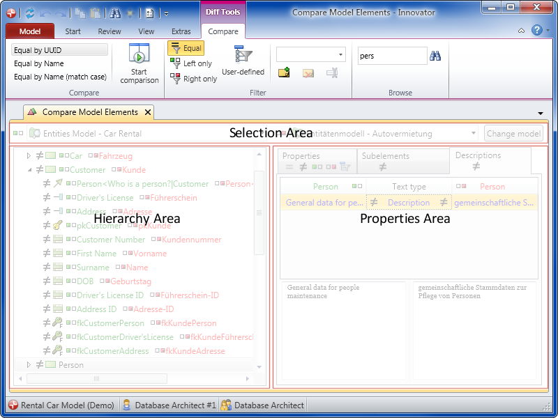You can use the Compare model elements editor to compare an element from the current model with another element from the same model or from a different model and display the differences. You can use filters to make the evaluation easier to read.