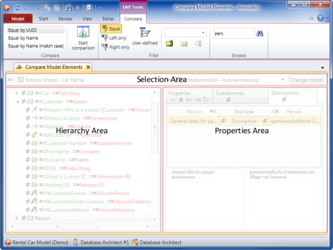 The editor is split into a top selection area for setting the model elements to be compared and an evaluation area below it with a hierarchy and property area.
