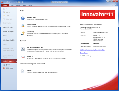 You can find information about your Innovator license here, including the precise version identification, serial number and host identification.