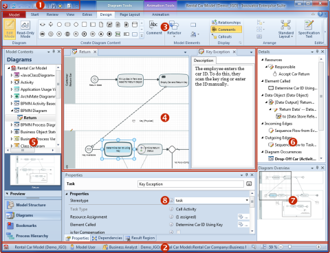 Tool windows provide specific structures and functions for navigating in the model, getting information about the model and its elements and so that you can work with the model elements.