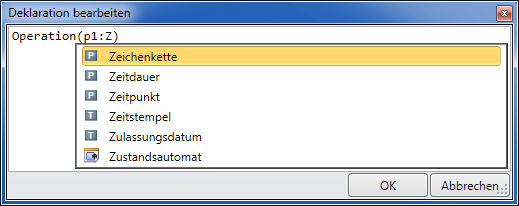 Für eine Operation ist nicht allein der Name, sondern auch die Anzahl und der Typ der Ein- und Ausgabeparameter entscheidend. Hier erfahren Sie, wie Sie die gesamte Deklaration einer Operation bearbeiten können. Als Eingabehilfe erscheint dabei die Intellisense-Auswahlliste.