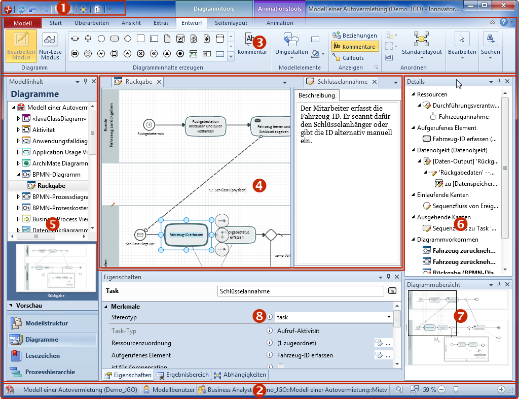 Dieser Teil der Hilfe beschreibt die einzelnen Bestandteile der Innovator-Benutzeroberfläche.