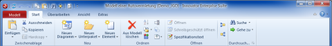 Im Menüband befinden sich neben dem Register Modell stets die Standardregister Start, Überarbeiten, Ansicht und Extras mit ihren Gruppen und Befehlen.