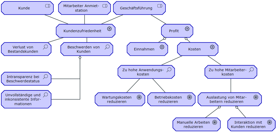 Goal Realization ViewpointFokussiert auf die Verfeinerung der initialen, übergeordneten Ziele in konkretere (Teil-)Ziele mithilfe der Aggregationsbeziehung und schließlich in Anforderungen und Einschränkungen mithilfe der Realisierungsbeziehung. |