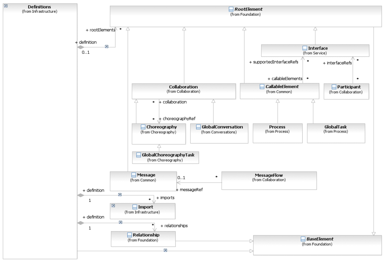 die abstrakte Oberklasse "Root Element" (dt. "Wurzelelement"), die die Laufzeitcontainer für die BPMN-Elemente zur Verfügung stellt; konkrete Wurzelelemente sind z.B. Kollaboration, Prozess und Choreographie.