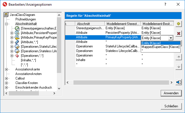 In den meisten Fällen bietet die Regel dazu die Möglichkeit, ein Stereotyp des entsprechenden Elements auszuwählen. Bleibt das Asterisk '*' eingestellt, dann gilt die Regel für alle Stereotype.