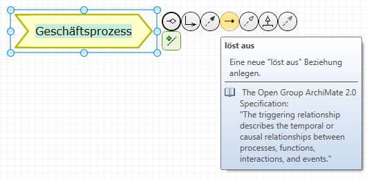 You can create various kinds of different connection types in Innovator diagrams in this way. The types of elements available in a diagram element's carousel and in the drop-down list primarily depend on the diagram type used, the model template used and the user role selected in a model.