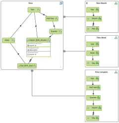 Dimension DiagramsDimension diagrams display dimensions and hierarchies as container nodes. They display the dimension levels and hierarchy levels with compartments for identification, display, and sort attributes. The dimension precedences are depicted as edges between the levels. |