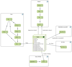Cube DiagramsCube diagrams display the analysis possibilities of multidimensional OLAP cubes to enable the coordination of specifications, for example, when communicating with specialist departments in the Business Intelligence area. The cubes and cube dimensions are displayed as nodes and the hierarchies they use are displayed as container nodes. The usage of hierarchies and the dimension precedence is displayed using edges. |