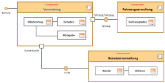 UML Component DiagramsComponent diagrams show a certain view of the modeled system's structure. The display normally contains components, their interfaces and how components are linked with each other using dependency relationships and connectors. |