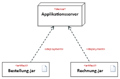 UML Deployment DiagramsDeployment diagrams show assignment of artifacts, e.g. from software components, to hardware elements, as well as communication links and dependencies between the hardware elements. |
