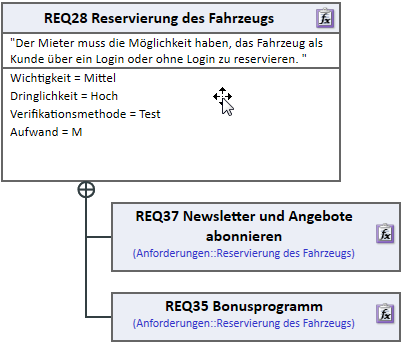 One requirement is a model element that contains the textual description of the requirement on the system in the Requirements Text specification type. This supports the implementation and checking of requirements in the development process of systems. This enables the user to e.g. import a business rule as text from a Word document and link it as a requirement with a use case or a task.